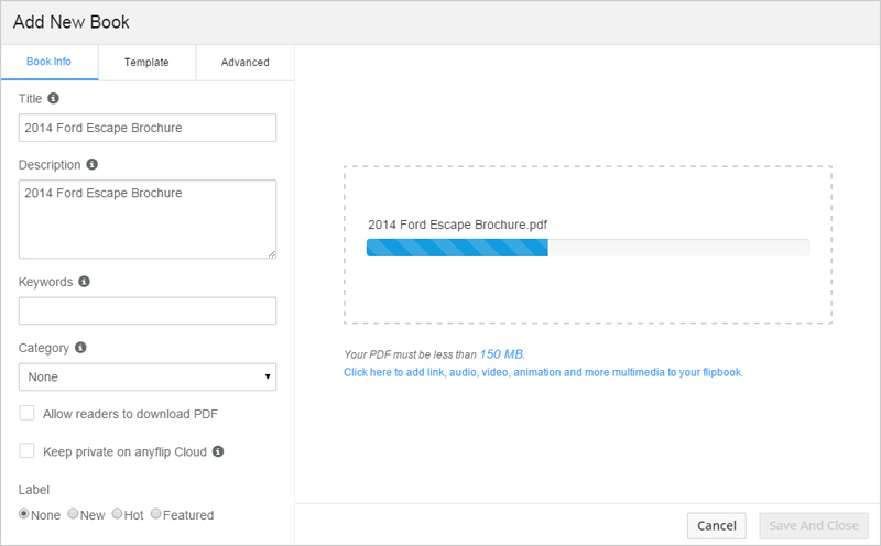 You can set Title, Description, Key words, Category and Label. You can also enable “Allow readers to download PDF” option to enable readers to download the source file. And if you enable “Keep private on anyflip Cloud”, your flipbook will not be accessible to others.