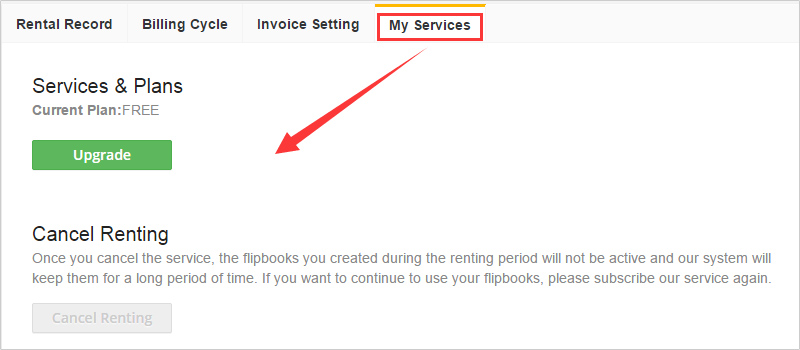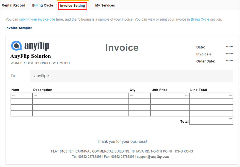 The Billing records all your expenditure for AnyFlip digital publishing service. This section includes Rental Record, Billing Cycle, Invoice Setting and My Services.
