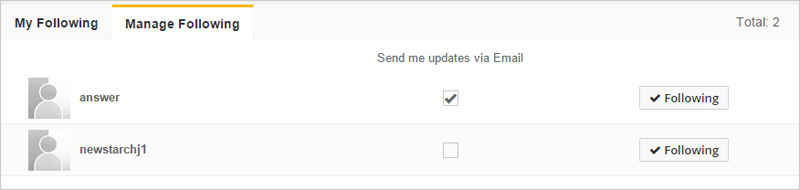 In the "Manage Following" part, you can see who you are following. You can check "Send me updates via Email" option to receive update Email once the digital content is updated. And you can stop following them anytime by move the mouse over “Following” and then clicking “Unfollow”.