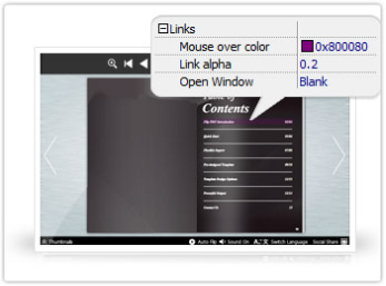If you have check "Import links" option in "Import PDF" interface, or add links in "Edit Page" interface, then you can define settings here, choose "Mouse over color", "Link alpha" (refers to the link area opacity, value interval: 0~1, "0" stands for the area is totally transparent), and "Open Window->Blank/ Self". The links also can be clicked after zooming by setting "Enable after Zooming in->Enable".