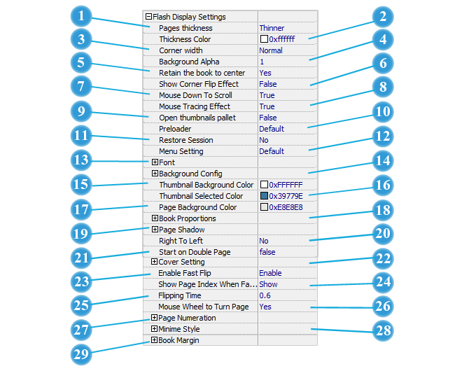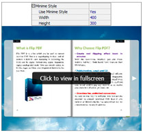 If you want to present Page-flipping eBook pages directly without showing toolbar, especially when you want to embed eBook into a small area in existing webpages, then you can use this "Minime Style". The Minime Style will trigger when the Width or Height of the Flash Container is less than the defined value. You can also always show the page-flipping eBook in Minime Style with adding a parameter to your URL like this: www.yourdomain.com/index.html?alwaysMinimeStyle=true.